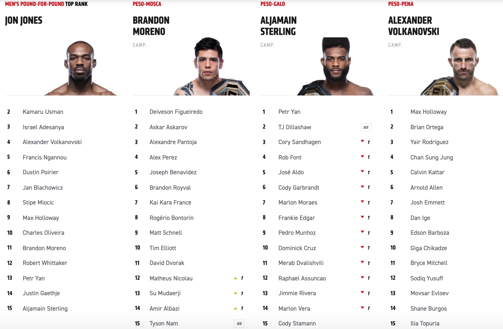 O retorno de TJ Dillashaw ao UFC depois da suspensão de dois anos por doping foi mais histórico que o esperado. Além do norte-americano ter vencido Cory Sandhagen na luta principal do evento da organização do último sábado, o lutador também decolou no ranking do peso-galo (até 61kg) e agora aparece em segundo, atrás apenas de Petr Yan.