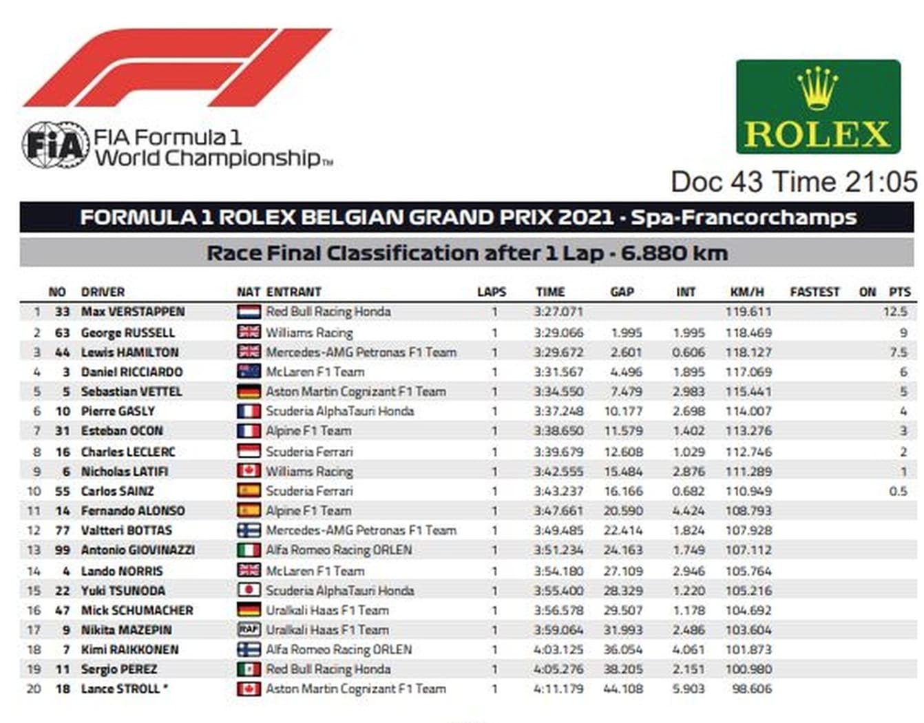 Desta maneira, Verstappen anotou 12,5 pontos e segue na vice-liderança da competição, agora com 199,5 pontos, apenas três a menos que o líder Hamilton. Segundo colocado, Russell garantiu nove pontos. Fechando os cinco primeiros da corrida, Daniel Ricciardo somou seis pontos, enquanto Sebastian Vettel anotou cinco.