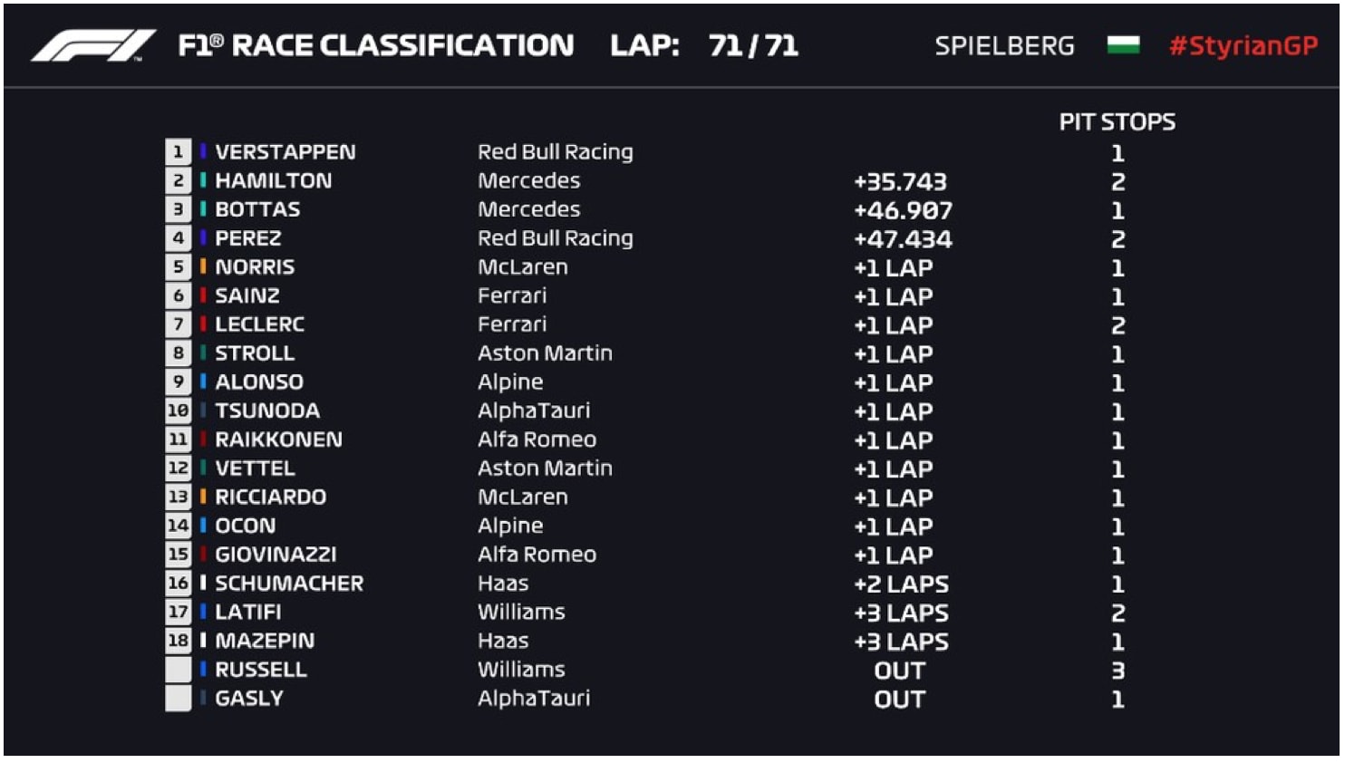 Foi liderando o GP da Estíria do início ao fim que Max Verstappen garantiu sua quarta vitória na atual temporada da Fórmula 1. O piloto da Red Bull Racing ainda venceu com tranquilidade e sem grandes ameaças de Lewis Hamilton no Circuito de Spielberg, na Áustria. O pódio foi completado pela dupla da Mercedes.
